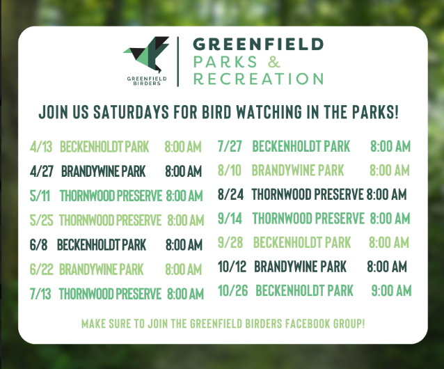 It is glorious to be a bird watcher in Greenfield, Indiana. There are 445 acres of parks in Greenfield counting the paved trails that connect them. From the months of April through October, the Greenfield Birders take advantage of these parks in search of all types of birds, common to exotic. There are 14 organized bird walks on the calendar for 2024. Bird walks take place in Brandywine and Beckenholdt parks, as well as one of the most popular places to seek out these festive feathered creatures, Thornwood Nature Preserve.