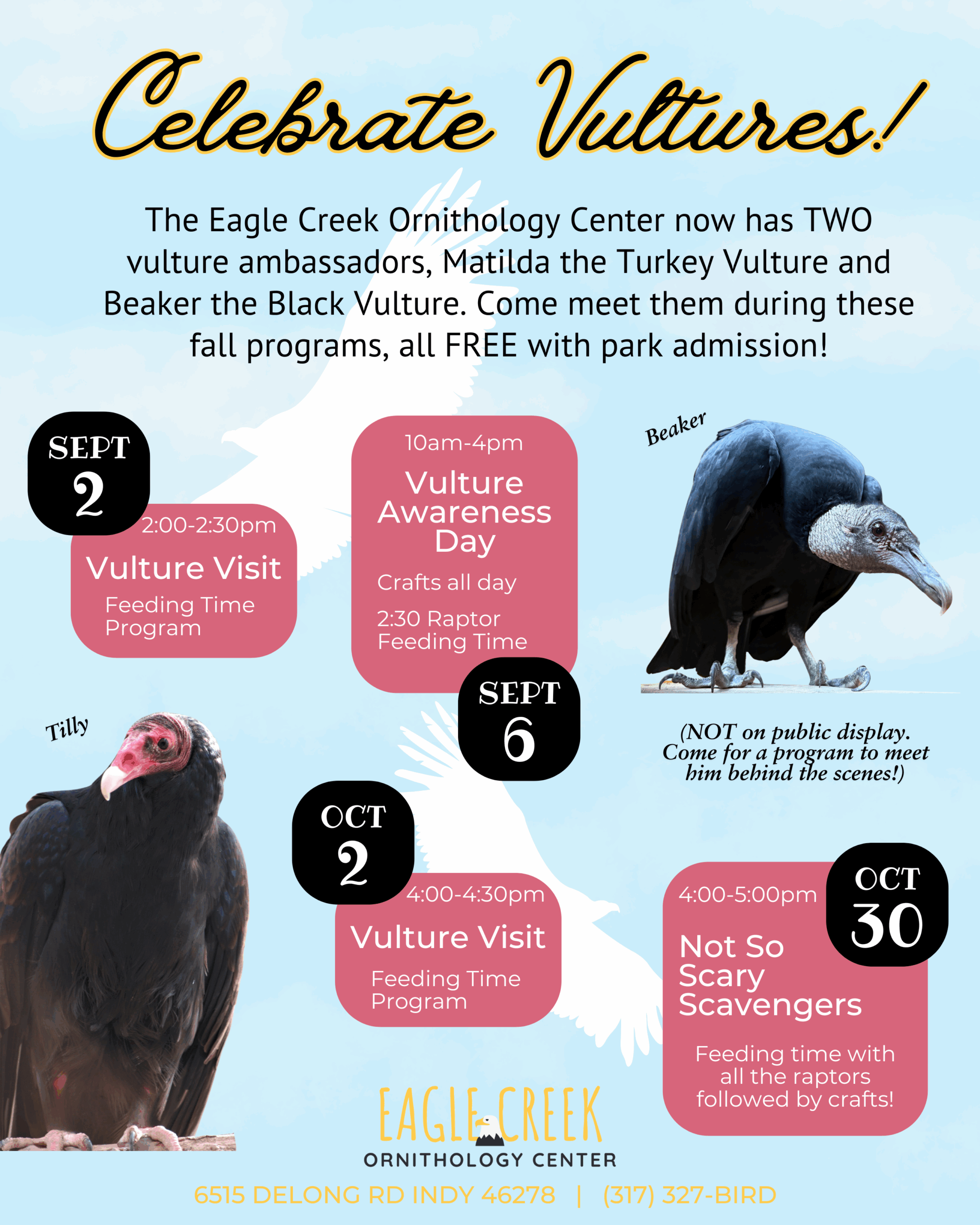 And come celebrate vultures and meet Beaker during these fall programs at the Ornithology Center: https://anc.apm.activecommunities.com/indyparks/activity/search?onlineSiteId=0&activity_select_param=2&activity_keyword=vulture&viewMode=list and https://anc.apm.activecommunities.com/indyparks/activity/search?onlineSiteId=0&activity_select_param=2&activity_keyword=scavenger&viewMode=list